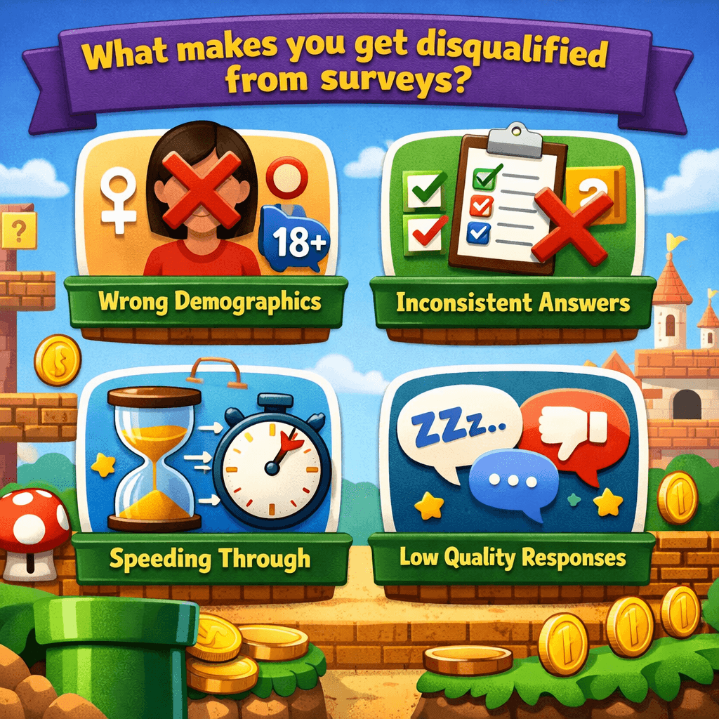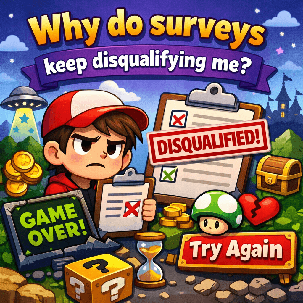 - Survey disqualification happens when your demographics don't match the specific research needs—companies target precise age, income, location, or behavior segments for each study.